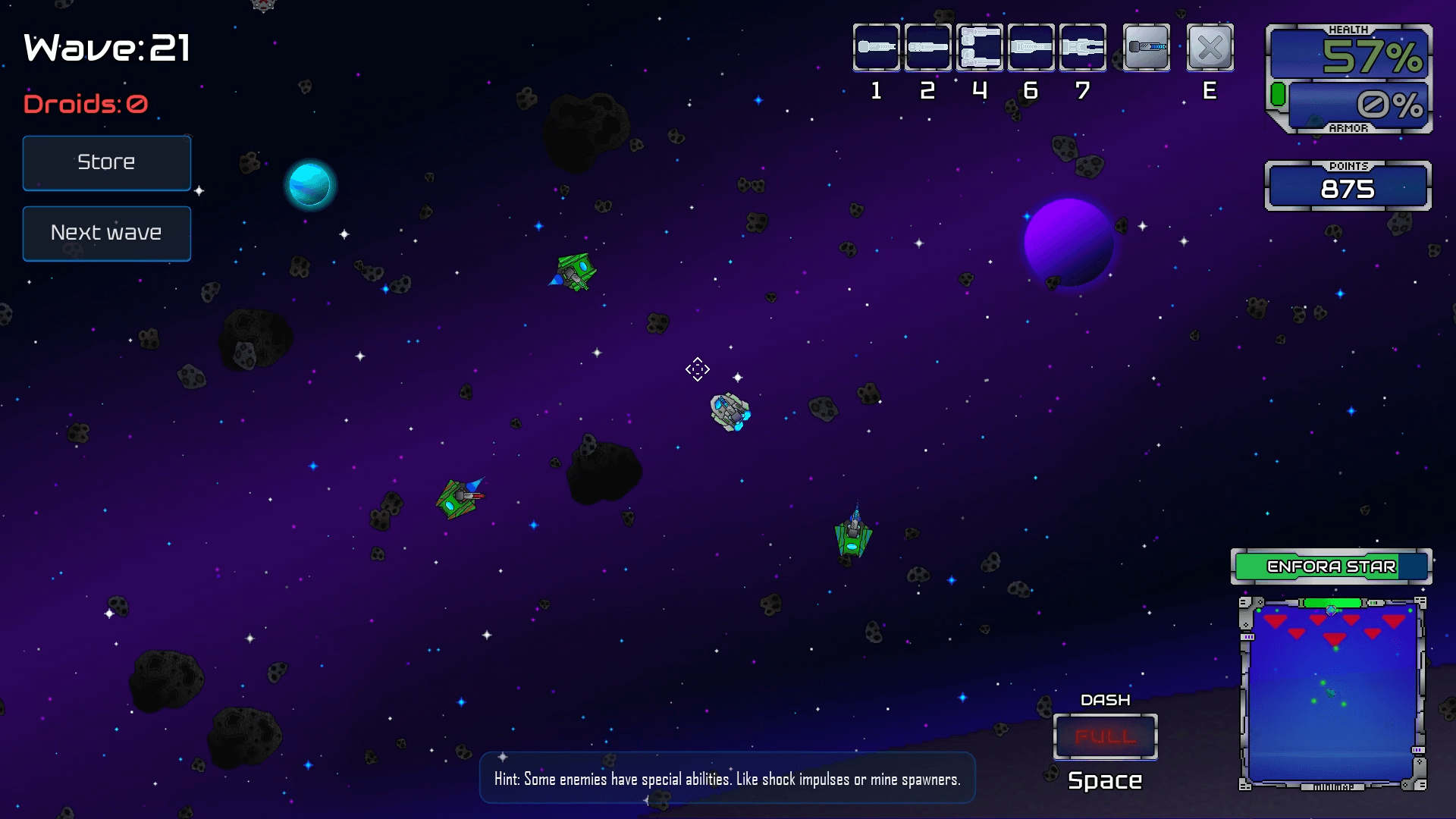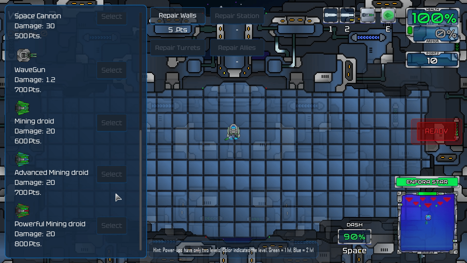 They are not the brightest ones either, but can really make a difference in the early levels and are fun to watch flying around. You can also repair them in the build phase, so remember to do so if you have plans to use them. As always, there are three different level variants for them: green is the lowest, blue is the mid-tier, and red is the most advanced one.
